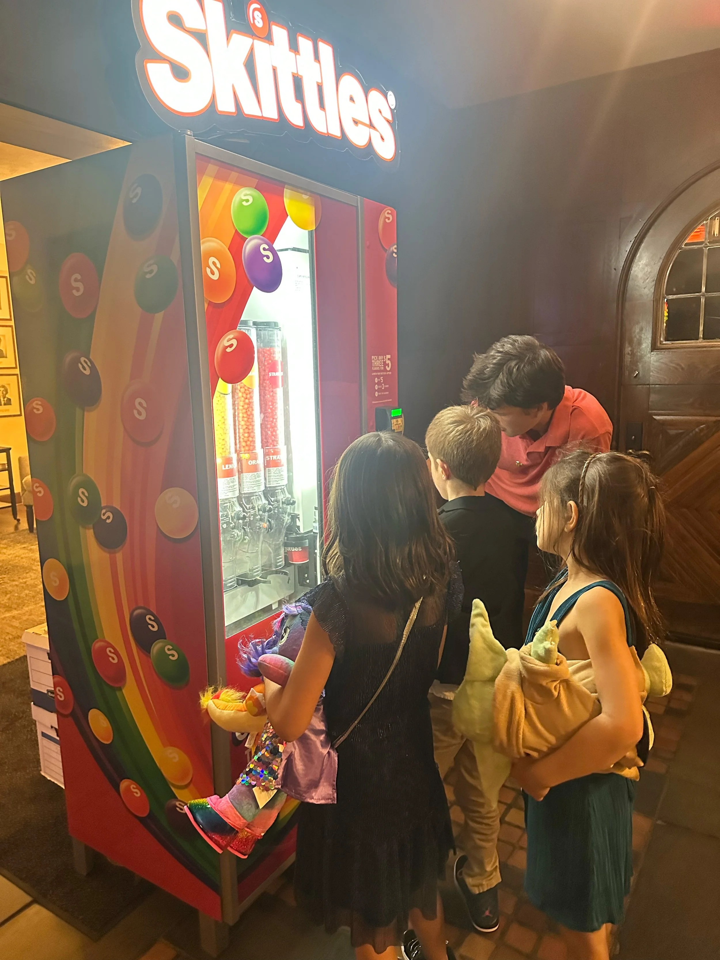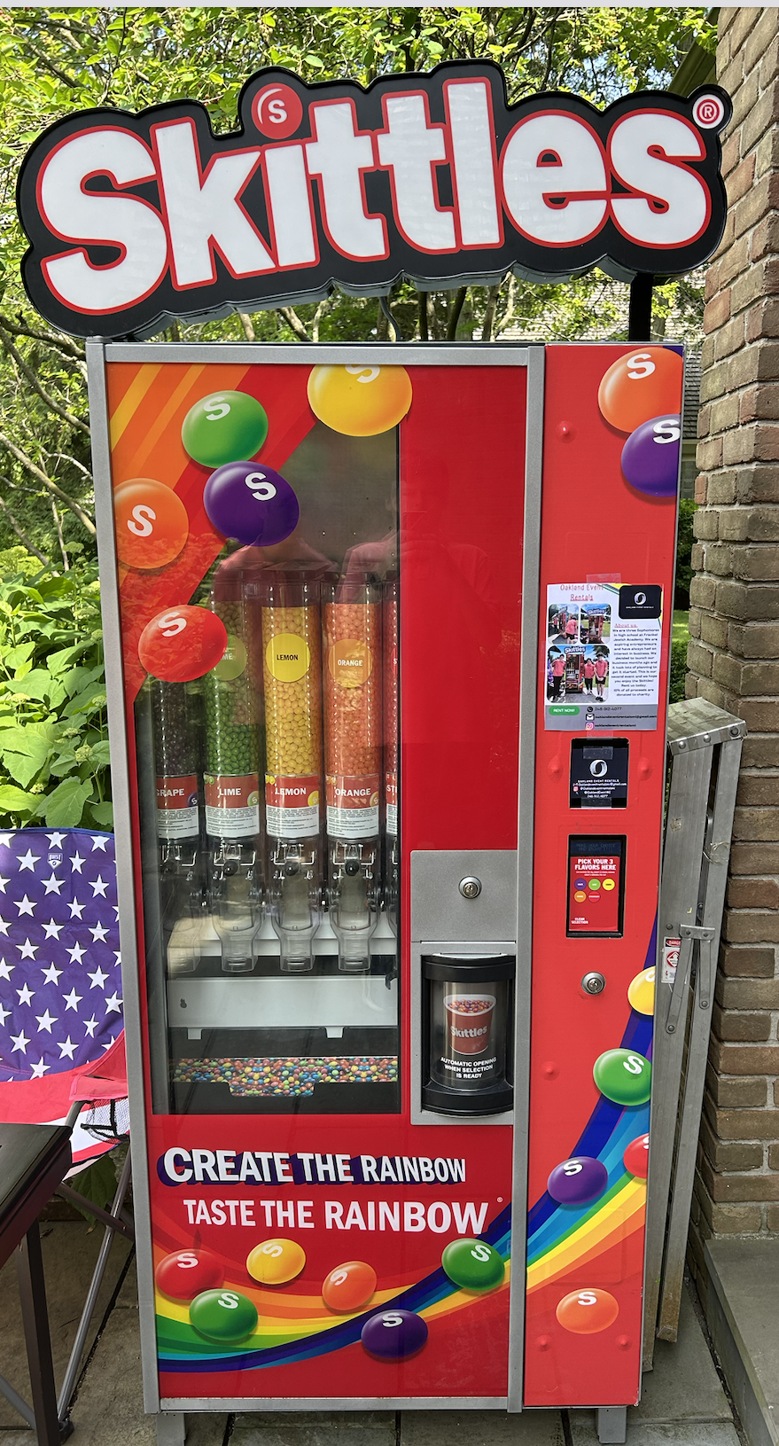 The Skittles Machine consists of five unique Skittles flavors. When the user walks up to the machine, they can choose three flavors. Their options are Lime, Lemon, Grape, Orange, and Strawberry. The machine automatically dispenses the candy into a cup. The user can then grab the cup and ENJOY!
